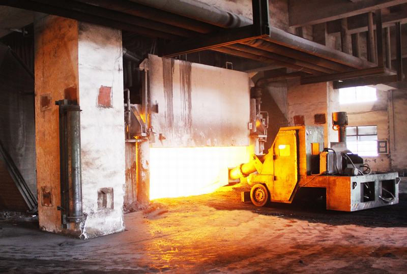 搗爐機(jī)正在對錳硅礦熱爐內(nèi)的料面進(jìn)行維護(hù)